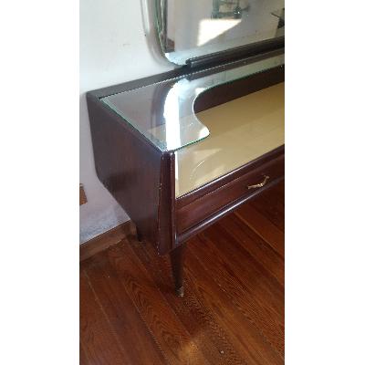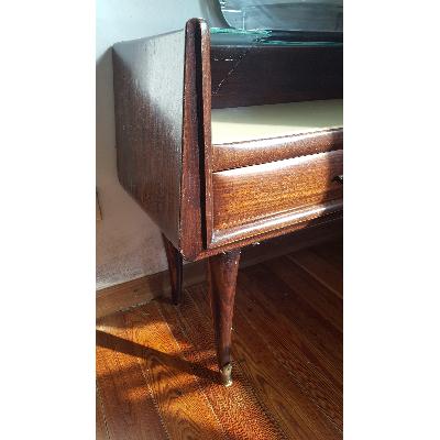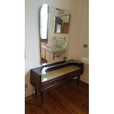 Console originale vintage anni '40 in legno di mogano bombato con base su gambe con zoccoletto in ottone ripianetto con vetro smaltato e base con due cassetti, sormontato da uno specchio